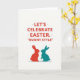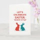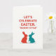 This card features a simple spring-themed layout with lots of white space and a crisp, modern look. Across the upper area, large crimson red text reads “LET’S CELEBRATE EASTER. ‘BUNNY STYLE’.” with small red dots acting like neat pauses between the words. Below the message, two sleek rabbit silhouettes face each other as if sharing a quiet, friendly moment 🐰. The left rabbit is bright red, turned toward the right, while the right rabbit is a deep teal, angled back toward its companion, creating a tender face-to-face connection. Each figure sits on the white background with a faint gray shadow under its base, giving a slight lift from the page. The strong red lettering above balances the two-color rabbits below, keeping the design focused and easy to take in 🌷. The scene shows the red and teal rabbits centered beneath the red headline, with soft gray shadows resting directly under their feet on the white field.