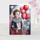 This enchanting birthday card features a charming male Pierrot clown dressed in a classic black-and-white costume adorned with glossy red heart buttons. His soft pastel hair and delicate face paint give him a dreamy, gentle expression. Surrounded by floating hearts and colorful balloons, the artwork blends whimsy with elegance, creating a magical, theatrical birthday atmosphere. Bold red text reads “Happy Birthday Remington”, making it a striking and memorable card design for fans of fantasy clowns and romantic pierrot aesthetics.