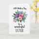 This card features a centered bouquet on a bright white background, arranged like a small celebration in bloom. Large clustered flowers in soft blue and deep lavender sit beside two roses, one coral pink and the other a creamy blush, leaning toward each other with a tender, close-knit feel ❤️. Smaller white and pale pink blossoms fill the gaps, adding a gentle, friendly softness to the arrangement. Teal-toned leaves and thin sprigs stretch outward, while tiny red berries dot the bouquet like little accents of warmth. The lighting is even and calm, keeping the colors softly blended and the edges airy rather than sharp. The message is placed above and below the bouquet in a flowing handwritten-style font, with the words reading “HAPPY Mother’s Day To a wonderful SISTER,” in a dark ink that stands out clearly. The top line sits centered above the flowers, and the lower line rests beneath the stems with generous white space around it 🌼. Blue and lavender petals cluster near the middle, with coral and blush roses slightly forward, and small red berries scattered around the outer edges.