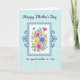 Esta tarjeta presenta un diseño alto con un brillante ramo centrado dentro de un panel rectangular blanco, como un regalo fresco ofrecido con afecto ❤️. Las flores mezclan pétalos de fucsia, rosa suave, amarillo soleado, azul calmado y púrpura suave, escondidos entre verdes frondosos y pequeños acentos en forma de estrellas que se sienten como un dulce momento compartido. Un borde de doble línea en azul medio y claro rodea el panel, dando al ramo una apariencia acogedora y abrazada. Remolinos decorativos de azul oscuro se sientan a la izquierda y a la derecha, añadiendo un toque antiguo sin sentirse pesados. Cerca del borde superior del marco, un pequeño pájaro de azul profundo descansa como si se detuviera a observar la escena 🌼. El fondo es de un aquamarina pálido con una textura de rejilla tenue que mantiene todo aireado y ligero. Letras de color índigo oscuro aparecen encima del ramo enmarcado y nuevamente debajo, escritas en un estilo de letra cursiva fluida. La línea superior se sit