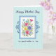 This card features a tall layout with a bright bouquet centered inside a white rectangular panel, like a fresh gift offered with affection ❤️. The flowers mix fuchsia, soft pink, sunny yellow, calm blue, and gentle purple petals, tucked among leafy greens and tiny star-like accents that feel like a sweet shared moment. A double-lined border in medium and light blue wraps the panel, giving the bouquet a cozy, embraced look. Decorative dark blue swirls sit to the left and right, adding an old-fashioned touch without feeling heavy. Near the top edge of the frame, a small deep-blue bird rests as if pausing to watch over the scene 🌼. The background is pale aquamarine with a faint grid texture that keeps everything airy and light. Dark indigo lettering appears above the framed bouquet and again below it, set in flowing cursive-style text. The upper line sits centered near the top margin, while the lower line is centered beneath the frame in the same dark indigo color.