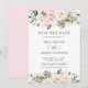 Esta tarjeta chic para guardar la fecha de la boda cuenta con un hermoso arreglo floral de acuarela en blush y marfil. Diseñada para coincidir con nuestra colección de boda Romantic Blooms. Personalízala con tus detalles de manera fácil y rápida, simplemente presiona el botón de personalizar para reorganizar y dar formato al estilo y ubicación del texto. (c) The Happy Cat Studio