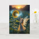 Una joven chica con alas de hadas toca un girasol brillante con su varita en un campo sereno al atardecer para el cumpleaños.