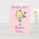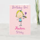 Cuta tarjeta de cumpleaños rosada que a cualquier niñita le gustaría. Un chica personalizado bonito con pelo rubio, mejillas rosadas y una sonrisa dulce. Ella lleva puesto un vestido azul con un guarnecido de encaje rosado y zapatos azules. Ella sostiene un pequeño ramo de flores en su mano. En la parte superior de la tarjeta, en un texto morado, están las palabras "Chica de cumpleaños". En la parte inferior puede utilizar la plantilla para cambiar el nombre de la tarjeta cambiando el texto del ejemplo. Dentro de la tarjeta hay una plantilla para añadir tu propio mensaje especial de cumpleaños.
