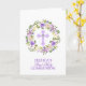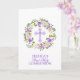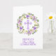 Bonita tarjeta personalizada de la ceremonia de la Primera Santa Comunión. Cruz violeta violeta de lavanda pastel clara con diamante falso en la corona floral de color medio y acuático. Letras de escritura modernas. Fácil de editar y añadir el nombre del chica.