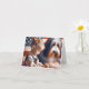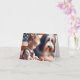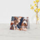 Pequeña niña pequeña con chicles rubios y las manos dobladas en la oración con tarjeta de perrito color con barba