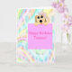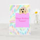 Adorable perro de niñita con una señal de primer cumpleaños e invitación en un paisaje de fondo de burbuja.
