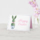 Esta tarjeta de felicitación de Pascua presenta una tierna topiaria de conejo verde con lazo rosa en una maceta de flores de chinoiserie azul y blanca. Personaliza los mensajes de vacaciones en la parte delantera y trasera con tu elección de texto especial.
