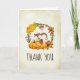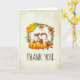 Una tarjeta de agradecimiento para cena, perfecta para un agradecimiento post-Día de Acción de Gracias. Diseñada con una ardilla de tierra adorable parada detrás de algunas calabazas acuarela naranjas. Una corona de follaje los rodea con una hoja de roble y flores naranjas y otros tallos y hojas. El fondo es un pergamino vintage falso de color crema, con un aspecto envejecido áspero. Mensaje personalizado dentro.