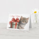 Obra acuarela de un lindo gatito con Navidades rojos inclinándose sobre una caja de regalo. Todo el texto es editable.