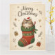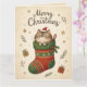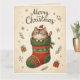 A festive illustration features a cute tabby cat wearing a Santa hat, nestled inside a green and red Christmas stocking. The stocking is decorated with traditional patterns. Above the cat, the words "Merry Christmas" are written in a decorative script. The background is a soft beige color, adorned with stars, dots, and sprigs of greenery.