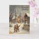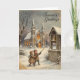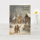 This greeting card shows a snowy winter scene painted in soft watercolor tones, with a small church as the main focus. The church has tall, pointed spires and warm yellow light glowing through its stained-glass windows, which stands out against the cool blue snow. In the front, two children with rosy cheeks wear winter coats and hats, and they lean back together as they pull a thick rope. Their faces look focused and happy as they ring a large bronze bell hanging in a small belfry on the right. Bare trees with white frost on their branches frame the scene, including a large tree on the left that stretches up into the dusky sky. In the upper right corner, the words “Season’s Greetings” appear in a flowing script style, standing out clearly against the sky. The paper looks slightly aged with a worn corner, giving the card an authentic look