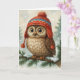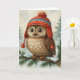 A cute owl in a bright red winter hat sits on a snowy pine branch, surrounded by softly falling snowflakes and evergreen trees in watercolor