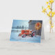 Red vintage farm tractor decorated with glowing white lights beside a rustic old barn adorned with a Christmas wreath in the snow.
