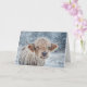 A shaggy, adorable Highland calf stands in the snow, peeking out from beneath its long bangs. With snow gently falling, this charming country scene is a perfect way to share Season's Greetings this Christmas.
