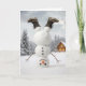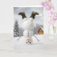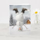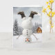 A whimsical snowman stands upside down with boots on its head as snow gently falls, revealing a cozy cabin in the snowy background