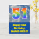 El frente de este divertido diseño de tarjeta de felicitación de cumpleaños número 51 presenta una representación de un cielo azul nublado, junto con el número "51" que tiene un patrón de gradiente de espectro de arcoíris multicolor. La parte frontal también presenta un mensaje de felicitación de cumpleaños, que incluye un nombre de destinatario personalizable. El interior presenta un mensaje de felicitación de cumpleaños personalizado, o quizás podría estar en blanco si se desea escribir un mensaje a mano. Una tarjeta de cumpleaños personalizada como esta podría ser una forma divertida de reconocer el cumpleaños número cincuenta y uno de alguien.