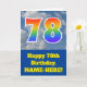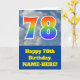 La parte delantera de este divertido diseño de tarjetas de felicitación por 78 años cuenta con una representación de un cielo azul turbio, junto con el número "78" que tiene un espectro multicolor de arco iris como el aspecto gradiente. La parte delantera también incluye un mensaje de bienvenida de cumpleaños, incluido un nombre de destinatario personalizado. El interior presenta un mensaje de bienvenida de cumpleaños personalizado, o tal vez podría ser borrado y dejado en blanco si se va a escribir un mensaje a mano. Una tarjeta de cumpleaños de personalizable como esta podría ser una manera divertida de enviar un mensaje para celebrar el cumpleaños setenta y ocho de alguien. [~Z0000370]