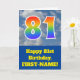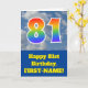 La parte delantera de este divertido diseño de tarjetas de felicitación de cumpleaños 81 presenta una representación de un cielo azul con nubes, junto con el número "81" que tiene un espectro multicolor de arcoiris como patrón gradiente. La parte frontal también incluye un mensaje de bienvenida de cumpleaños, incluido un nombre de destinatario editable. El interior presenta un mensaje de bienvenida de cumpleaños personalizado, o tal vez podría ser borrado y dejado en blanco si se va a escribir un mensaje a mano. Una tarjeta de cumpleaños personalizada como esta podría ser una manera divertida de reconocer el 80 primer cumpleaños de alguien. [~Z0000370]