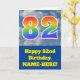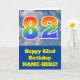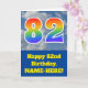 La parte delantera de este divertido diseño de tarjetas de felicitación de cumpleaños número 82 cuenta con una representación del cielo azul turbio, junto con el número "82" que tiene un espectro multicolor de arcoiris como el patrón gradiente. En la parte delantera también se incluye un mensaje de bienvenida de cumpleaños, incluido un nombre de destinatario personalizado. El interior presenta un mensaje de bienvenida de cumpleaños editable, o tal vez podría ser borrado y dejado en blanco si se va a escribir un mensaje a mano. Una tarjeta de cumpleaños personalizado como esta podría ser una manera divertida de enviar deseos de cumpleaños a alguien que está celebrando su cumpleaños número ochenta. [~Z0000370]