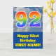 La parte delantera de este divertido diseño de tarjetas de felicitación de 92 años presenta una representación del cielo azul turbio, junto con el número "92" que tiene un espectro multicolor de arcoiris como el patrón gradiente. La parte delantera también incluye un mensaje de bienvenida de cumpleaños, incluido un nombre del destinatario del personalizable. El interior presenta un mensaje de bienvenida de cumpleaños personalizado, o tal vez podría ser borrado y dejado en blanco si se va a escribir un mensaje a mano. Una tarjeta de cumpleaños de personalizable como esta podría ser una manera divertida de reconocer el cumpleaños noventa de alguien. [~Z0000370]
