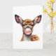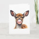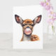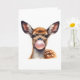 Dibujo de acuarela adorable de un ciervo soplando burbujas de chicle en esta tarjeta de felicitación en blanco.