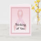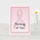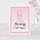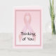 Ilustracion gráfico de una cinta de reconocimiento del cáncer de mama rosa de la artista/diseñadora Charmaine Paulson en una tarjeta de felicitación. La tarjeta tiene (personalizable) el texto "Pensando en ti" en la parte delantera, y las plantillas para tu texto dentro. ©2012charmainepaulson