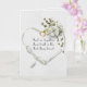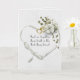 Corazón de cinta de satén de boda blanca con ramo de hiedra y anillos de corazón de oro para felicitaciones a recién casados. El texto es editable.