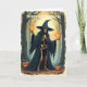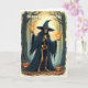 Esta hermosa tarjeta de saludo ilustrada muestra una clásica bruja esquelética de Halloween en un gorra puntiagudo negro, bajo una luna brillante. Ideal para los amantes del arte de Halloween vintage, la estética brujera y la magia estacional. Hace un gran saludo coleccionable o reflexivo para los entusiastas de Halloween.