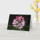 Tarjeta de saludo en blanco con hermosa flor Cleome en la fuente