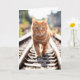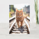 Ginger tabby cat caminando por vías férreas. Se puede cambiar todo el texto.