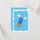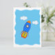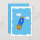 Tarjeta de saludo personalizado con cohete personalizado y nubes con efecto de impresión de noticias sobre fondo azul. Diseño original. En blanco en la parte posterior para mensajes manuscritos.
