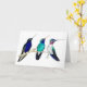 Tarjeta de acuarela pintada a mano para los amantes de las aves con tres especies de colibríes, un colibrí Coronet, un colibrí de gran tamaño y un colibrí de garganta estelar de larga factura.
