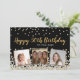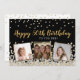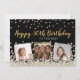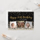 Elegante diseño de tarjetas de cumpleaños personalizado con confeti de oro y plata brillantes sobre fondo negro, tipografía de escritura moderna con las palabras "Feliz cumpleaños número 50" y tres de tus fotos favoritas enmarcadas en Relieve metalizado de oro metálico en la parte delantera de la tarjeta junto con tu mensaje y cerrando en la parte posterior.