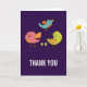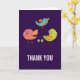 Una carta de agradecimiento con un trío de pájaros dibujados a mano adorables y caprichosos. Dos de los pájaros están de pie junto a algunos pequeños pinos verdes entre sus pies. Otro pájaro azul está volando en el aire entre ellos. Fijado sobre un fondo púrpura.