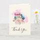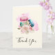 Gracias tarjeta de felicitación con una imagen encantadora. 3 macarones coloridos, rosa, verde y azul con un elegante ramo de flores rosa y un toque de color rosa de agua detrás. ¡Delicioso y elegante también!