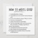 El gracioso diseño del escritor "Cómo escribir bien" es un simple diseño de texto con una lista de diez graciosos, jugar con las palabras, reglas a seguir al escribir. El diseño de esta escritora simple y divertidísima hace un buen regalo para los profesores, escritores, novelistas, periodistas y todo aquel que escriba o enseñe inglés para ganarse la vida.