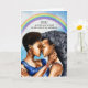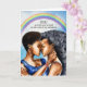 La tarjeta perfecta para regalar a esa mujer a la que llamas a tu cónyuge. Dos magníficas mujeres de piel marrón abrazan una romántica acuarela bajo un arcoiris con una olla de mensaje de oro en esta tarjeta de aniversario para la pareja lesbiana.