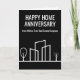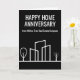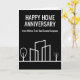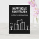 Esta tarjeta de aniversario de Happy Home de moda está hecha a medida con el nombre de su compañía de bienes raíces. Estas tarjetas en blanco y negro presentan un simple dibujo de una línea de un barrio con un árbol a cada lado. Envíe a clientes anteriores para recordarles que recomienden a amigos y familiares que buscan comprar o vender su hogar. El marketing de negocios de bienes raíces significa llegar a clientes habituales y pedir sus referencias.