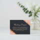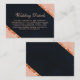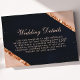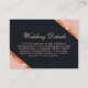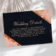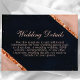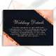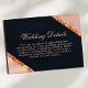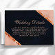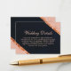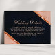 Tarjeta de detalles de boda geométricos rosa cobre y azul marino. Este elegante diseño abstracto moderno presenta rosa pálido y azul marino acentuado con líneas de cobre metálico de lámina falsa y confeti.