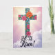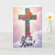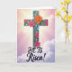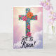 Este diseño muestra una cruz alta y estilizada centrada en la tarjeta, con un aspecto texturizado y casi tallado que le da profundidad. Flores brillantes de color rosa y naranja cálido se agrupan a lo largo de la cruz, sus pétalos superpuestos sugieren un abrazo suave y afectuoso, mientras que formas florales más pequeñas de color turquesa añaden un toque amistoso y compañero. Pequeños puntos y acentos de color azul claro se sientan alrededor de las flores, como pequeñas notas de celebración, con una 🌷 metida en el ambiente primaveral. Detrás de ella, el cielo se desvanece de rosa dorado cerca de la parte superior a un lavanda tranquilo en la parte inferior, con delgadas nubes que flotan a través. Rayos de luz se extienden desde detrás de la parte superior de la cruz, formando un efecto de halo suave que atrae la vista hacia arriba. Cerca de la parte inferior, las palabras “¡Él ha resucitado!” están colocadas en letras grandes, en una tinta oscura que se destaca