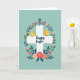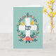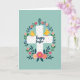 Diseñado con un fondo azul verdoso suave y silenciado, la tarjeta se centra en una simple forma de cruz blanca salpicada con pequeños puntos de tonos suaves. Una corona ovalada la rodea, llena de hojas verdes profundas y flores primaverales en rosa, fucsia, melocotón y azul suave, dando a la escena un ambiente acogedor y unido como amigos que se reúnen cerca 🌷. Dos pequeños pollitos amarillos se posan en la forma blanca, sus picos naranjas inclinados entre sí como si compartieran un momento tranquilo y afectuoso 🐰. La frase "Feliz Pascua" se sitúa en la barra horizontal media en un estilo de caligrafía fluida, mostrado en un tono más oscuro que destaca claramente contra el blanco. Pequeñas motas blancas y marrones aparecen alrededor de la corona y en la forma central, repitiendo la textura punteada y añadiendo un toque ligero y aireado. Las flores varían en tamaño y espaciado, con pétalos agrupados cerca de la parte superior y los lados y algunas flores escondidas más abajo para equilibrar. La disposición general mantiene la corona enmarcando el centro mientras los