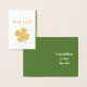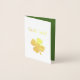 Tarjeta de Relieve metalizado de buena suerte, con un Relieve metalizado dorado de cuatro clavijas de hojas. con fondo verde en el interior, se puede personalizar con tipografía blanca. Genial por desear a alguien felicitaciones por su nuevo trabajo o nueva aventura.