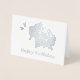 Una tarjeta de cumpleaños de Relieve metalizado plateado asombrosamente hermosa y simple, que en su parte delantera incluye un elefante bebé en suelo marrón. Ella sostiene un montón de globos cardíacos con su baúl. Debajo tiene un deseo de cumpleaños. Diseño original disponible exclusivamente en ©EleSil tienda online.