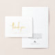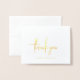 Clásica y elegante tarjeta de agradecimiento nupcial con un sencillo diseño con "gracias" en un guión moderno y sus nombres y fecha boda a continuación. Todo el texto del frente está en Relieve metalizado oro real. El diseño limpio y minimalista hace que este boda le agrade mucho por un boda tradicional y formal.