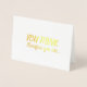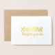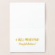 ¡Celebra un importante logro profesional de tu colega, amigo o ser querido con esta tarjeta! El mensaje es un juego de palabras con la frase del filósofo René Descartes "Je pense, donc je suis [creo, por lo tanto, lo soy]" ("cogito ergo sum"). La parte delantera de la tarjeta dice: "USTED PIENSA", seguida de "por lo tanto usted es..." en papel de broche de Relieve metalizado dorado (pincel de brocha) y letras de guión. Al abrir la tarjeta, la frase continúa: "¡UN PROFESOR COMPLETO! ¡Felicitaciones!" en un tono de oro a juego. Perfecto para ascender a profesor de pleno derecho en cualquier campo académico o disciplina.