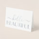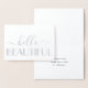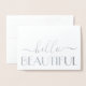 Envía notas elegantes para cualquier ocasión con tarjetas de notas dobladas de papel de aluminio plateado Hello Beautiful. Todo el texto de esta plantilla es fácil de personalizar o eliminar, y los estilos de fuente se pueden cambiar con la herramienta de diseño de Zazzle. El diseño minimalista moderno y elegante cuenta con auténtico papel de aluminio plateado metálico en la parte frontal, letra de caligrafía elegante y tipografía con estilo art déco vintage. Estas elegantes tarjetas personalizadas se pueden personalizar como notas de agradecimiento, tarjetas de "pensando en ti" o para cualquier propósito que desees.