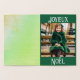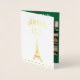 Una tarjeta de Noel verde y dorada alegre que presenta cuatro secciones de diseño distintas. Una es una impresión a todo color dentro de la tarjeta. Una pequeña dama vintage está vestida con un gorro y un abrigo de piel verde. Satisfecha en un asiento en París. A lo lejos está la Torre Eiffel. Joyeux Noël es el francés para "Feliz Navidad". 2. Dentro de la tarjeta, hay un fondo que parece pergamino verde. Puedes agregar una foto o mensajes. 3. Fuera del frente: la torre Eiffel y el saludo de Navidad francés Joyeux Noel están impresos en lámina dorada sobre un fondo blanco. 4. Detrás de la parte exterior: la torre Eiffel está impresa en lámina dorada sobre un fondo blanco.