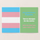 Esta increíble tarjeta de felicitación de reasignación de género con lámina de aluminio presenta una imagen de arte digital de una oruga con una cara triste, un capullo o crisálida y una mariposa. La oruga es azul en la parte posterior y se vuelve más pálida y morada con cada segmento del cuerpo. Tiene bonitas antenas rizadas y ojos grandes con pupilas pálidas. Está triste porque quiere cambiar de género. El capullo es azul, rosa y blanco, representando la bandera del orgullo transgénero y el cambio de género o metamorfosis. La mariposa es rosa con bonitos patrones en sus alas y una gran sonrisa en su rostro. Representa la felicidad después de que se ha completado el cambio de género. Este diseño es para la reasignación de género de hombre a mujer. Este diseño es para mostrar mi amor y apoyo a todas las personas trans y a aquellos que las aman y apoyan. La bandera del orgullo transgénero está representada en el interior y hay texto en la parte frontal en los colores de la bandera del orgullo transgénero que dice Trans y Orgulloso. Hay texto personalizado