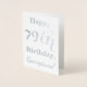 Este sencillo y elegante diseño de tarjetas de cumpleaños de Relieve metalizado plateado incluye un mensaje como "¡Feliz cumpleaños 79, Georgiana!" en la parte delantera. El nombre ("Georgiana") se puede cambiar para personalizar la tarjeta. En el interior aparece un mensaje de personalizable como "¡Que tu cumpleaños 79 sea feliz y alegre!". Se podría dar a alguien que esté celebrando su cumpleaños setenta y nueve. [~Z0000009]